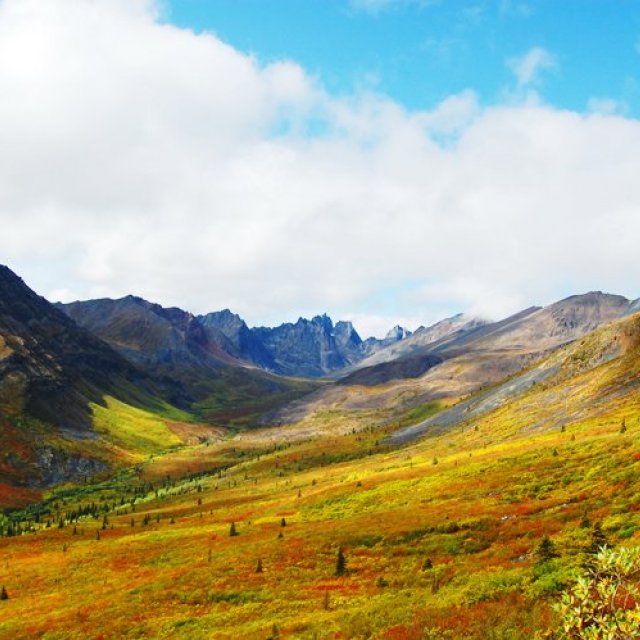 After getting up early we drive up the Dempster Highway which is 730 km long and is the only year-round road connection to the Arctic Sea. After a short visit at the Tombstone Visitor Center we are ready to start our hike at the foot of the Tombstone Mountains; this will lead us into the tundra of this mountain range, where every season has its unique attraction. From the top of the trail, hikers have an exceptional 360 degree panoramic view of the surrounding landscape, including Discovery Ridge, North Fork Pass, and Fold Mountain.